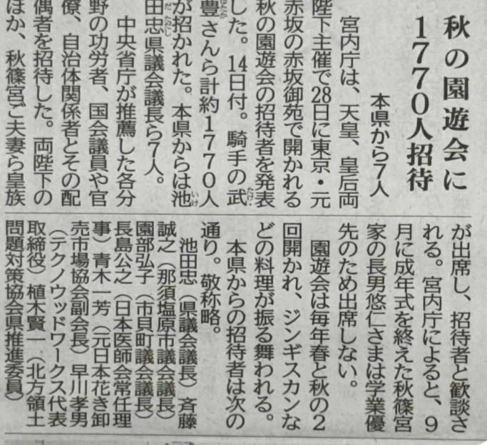 SLOC構成者であり、日医常任理事にてご活躍中の長島公之先生(栃木県下都賀郡)が来たる10月28日赤坂御苑で開かれる秋の園遊会に招待されましたことをご報告致します。おめでとうございます。